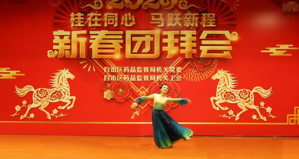 团拜会在舞蹈《鸣征鼓·启华章》的激昂鼓乐与飒爽舞姿中拉开序幕,瞬间点燃了全场热情。歌伴舞《不忘初心》,以动人的嗓音和优美的舞姿,唱响药品安全社会共治的协奏曲,舞出守护人民健康初心的坚定信念。舞蹈《岁启忆芳华》,干部职工化身“舞林高手”,用充满活力的舞步展现奋斗芳华与别样风采。小品《药缘联播快讯》以幽默诙谐的“新闻播报”形式,生动演绎广西药监的对外交流合作。舞蹈《文袖承章》,巧妙融合书简与水袖,以优美的舞蹈诠释文化传承的深厚底蕴与工作的严谨风骨。歌伴舞《你被写在我的歌里》用歌声与舞蹈诉说药监人平凡日子里的坚守与光芒,温情脉脉,深情感人。小品《小药来了》紧扣网络直播新业态下的药品监管现实,以风趣幽默的方式展现监管人员如何练就“火眼金睛”,智破网络违法销售假劣药品迷局。三句半《药监卫士成长记》,语言精炼、节奏明快,以轻松诙谐的形式道出药监人成长蜕变的心路历程。诗朗诵《瑶乡药香》展现乡村振兴工作队员扎根乡土、助力乡村振兴的动人画卷,字里行间洋溢着对瑶乡发展的深情;舞蹈《八桂药监人》生动诠释广西药监铁军守护药品安全底线、勇担健康使命的坚定决心与昂扬斗志。合唱《像我们这样的团队》唱出团结协作,严格把守药品安全准入关的团队精神与职业自豪。小品《托梦办证》展现12345热线及审批人员面对各类诉求时认真负责、耐心专业的职业素养。舞蹈《灯火华章》,舞者们手持传统非遗滚灯翩跹起舞,寓意着药监事业如灯火传承,华章璀璨。八段锦表演《马步生风 八段迎祥》在弘扬中华传统健身文化的同时,也寄寓对全体同仁身心健康、精神焕发的美好祝愿。舞蹈《踏春行》,以轻盈欢快的舞步,带领大家仿佛置身盎然春意之中,表达对新的一年美好生活的向往与追求。团拜会在气势恢宏的大合唱《我会一直顺》中接近尾声,唱出对事业顺遂、家庭美满、万事如意的最朴实新春期盼。